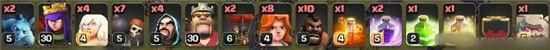 实际用兵及部队分工如下,楼主看到转转砸墙比较闹心就给了狂暴,治疗似乎并没有保住野猪,不过反正不是主力,挂就挂吧,弹板似乎都集中在大本附近,弹掉我好多兵,但不影响收尾。