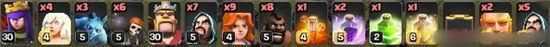 实际用兵及部队分工如下,由于右侧连弩攻击范围覆盖到墙外,因此多带个炸弹,那两个气球是捐兵剩下的,实际用处不大。