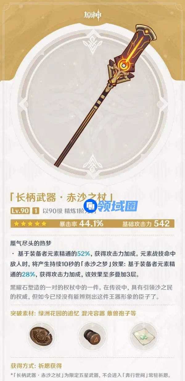 原神作为一款制作精良的二次元风格的游戏,以不少动画内容来保持二次元概念,不断的延展并完善世界的构架,从而做到在玩家心目中留下深刻的印象,与其他游戏的最大区别于在于其故事、设定和人物形象的设计,玩过很长一段时间的大佬基本明白原神的设计独到之处。游戏中赤沙之杖是版本更新后会新增一把武器,该武器达到90级的基础攻击力白值只有542,副属性是44.1%的暴击率,和磐岩结绿是同一个模板,有需要的武器可以等获取顺便获取,泛用性目前还没上线之前还不能确定,接下来为大家介绍一下原神赤沙之杖属性强度一览。