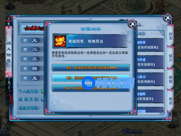 6. 结义缘需要结拜关系中所有玩家达到一定条件后可以激活,这些条件可能是玩家等级,VIP等级,装备评分,宠物评分,总结义等级等,激活结义缘后可以获得该结义缘提供的增益,比如练功区经验值提高,摇钱树奖励提高,人物宠物侠客属性提升.等。
