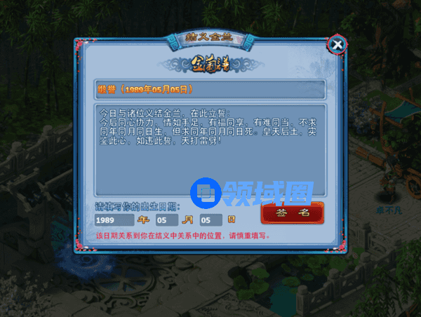 3. 然后所有玩家在金兰谱上填写自己的出生日期,交给柯镇恶,每人付出200元宝以后即结拜成功,结拜成功后可以设置结拜称号,称号设置第一次是完全免费的,结拜称号设置完成后,所有结拜成员会获得该脚底称谓。