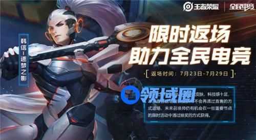 7月23日0:00-7月29日23:59,韩信-逐梦之影皮肤限时返场助力“全民电竞”。逐梦之影作为KPL专属限定皮肤,科技感十足,本次直售返场后该皮肤将不会再通过直售的方式返场,未来召唤师仍有机会在一些重要节点的限时活动中通过抽奖的方式获得。