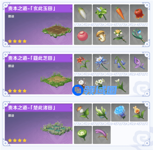 首先玩家需要在家园每放置田亩,田亩一共有三种,对应不同的作物(见下图):