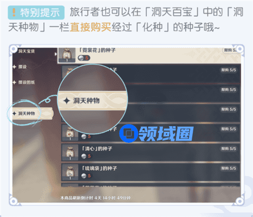 此外,在家园的洞天百宝商店中,也会新增洞天种物页面,在该页面也可以直接购买需要的种子,每日限购5个。