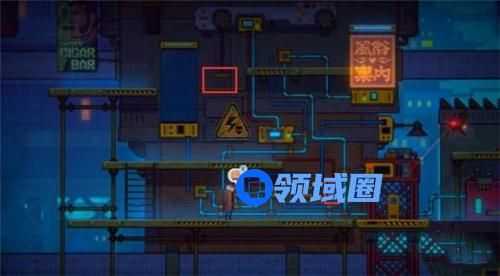 往前走遇见巡逻机器人,威廉帮我们处理掉,调查机器人获得【巡哨无人机】档案,跳到右边。一直向右走,拉下供电设备,注意躲避巡逻机器人的视线。