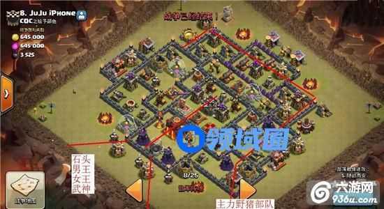 野猪部队随后五点钟放置,全程绕圈进攻,三个回血保驾,以保证该部队最大攻击力。这种打法的最大好处是,中路部队完全吸引火力,使野猪可以从容绕圈进攻,并且野猪部队进攻路线上,没有放置大炸弹的地方,存活率比较高。
