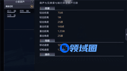 小紫葫芦威力:60,便携:84,范围61。轻击伤害:70点、1米,角度25度。重击伤害:148点、距离1.23米,角度25度。