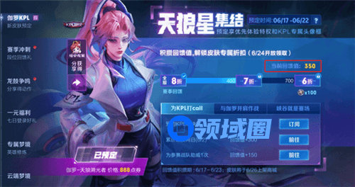 2、本次KPL皮肤预定活动,所有召唤师还可以通过完成任务积攒回馈值,解锁购买皮肤的个人专属折扣,最低6折!(个人专属折扣在皮肤价格888点券基础上打折)