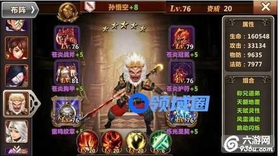 2、孙悟空,这个不用多说,大家十分熟悉的英雄。苍炎套装,既加命中又加暴击,命中石和暴击石,而且悟空有一定的闪避或者格挡能力,这个方面也可以选一个方面进行加强。