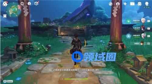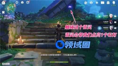 四下环顾这所谓的「好运最高处」,似乎也只有周围这一圈石灯有些突兀,不如我们尝试把这些石灯点亮看看吧。不过附近并没有雷樱枝条,因此我们需要用雷灵来解锁石灯。