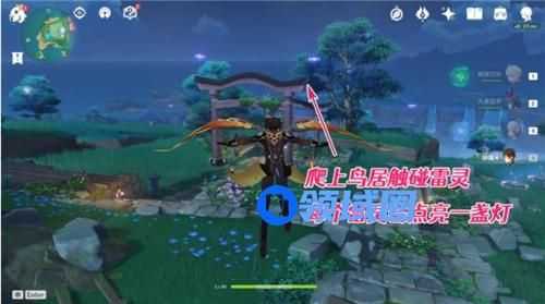 雷灵1触碰完成之后,就会出现雷灵2、3,在鸟居顶上,触碰后分别再为我们点亮1个石灯: