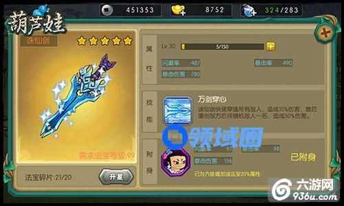 在游戏中,每一个葫芦娃都可以拥有一款为自己量身定制的法宝,并且法宝附身之后,葫芦娃的各项战斗值都会有很大的提升,根据每个娃的角色不同,他们的法宝对自己的提升方向也是不同的,比如六娃的定位是物理输出型英雄,那么他的法宝也将以提升攻击力和暴击为主。值得一提的是每个战斗法宝还有特定的法宝技能哦!