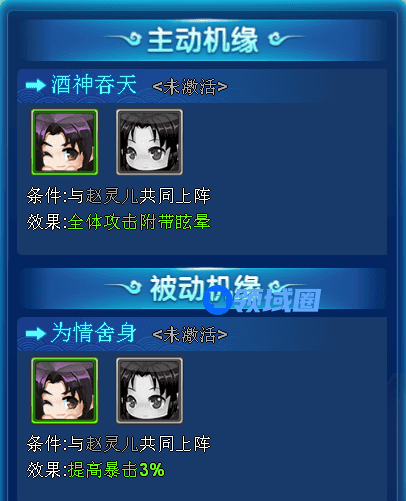 机缘:人物卡牌与有机缘效果的卡牌一起出战时,将会激活机缘技能效果,机缘效果包括被动属性加成和战斗主动技能,在战斗中主动的机缘技能可点击左下角的技能图标进行释放。技能释放后进入冷却CD时间。