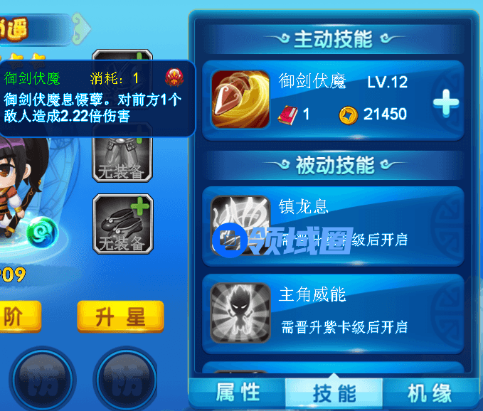 卡牌人物的技能分为主动与被动,主动技能消耗铜币可进行升级。按住技能图标后可查看该技能详细描述和技能效果,当前技能释放需消耗的职业技能珠。技能等级 越高消耗的铜币数量越大,当技能升级到10级后继续学习需要一定数量的秘籍。当人物品阶达到一定等级后,将会开启对应的被动技能。