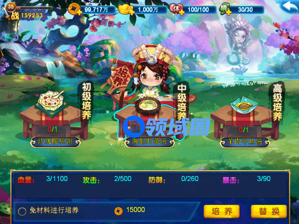 2.不同级别的培养需要消耗不同食材,初级培养必须使用菜肴。中级培养初使用菜肴外还可使用免呆料培养,如有上图左下方,点击后消耗1.5W铜钱即可,高级培养同中级培养一样,也可以使用免材料培养,需要消耗50元宝。