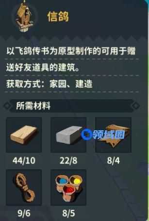 首先玩家要想增加羁绊,需要先建造一个信鸽,信鸽需要在家园进行建造,材料如下: