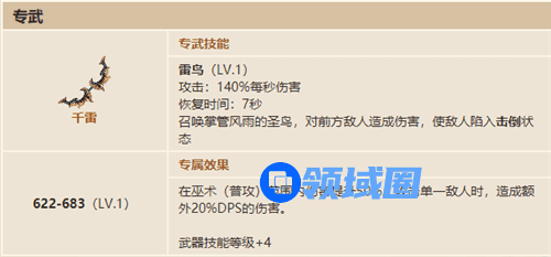 这个专武的特效还是挺不错的,提升普攻范围内会提升伤害,攻击单一敌人时造成额外20%的伤害,武器技能等级可以+4。
