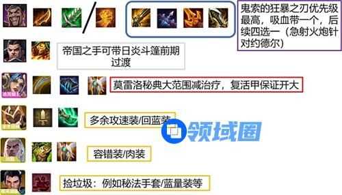 1、开局抢攻速/腰带,攻速是为主c帝国之斧装备,腰带则是可以合日炎斗篷更好的连胜过渡。