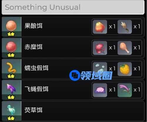 鱼饵目前知道的有5种,分别是果酿饵、赤糜饵、蠕虫假饵、飞蝇假饵和荧草饵。