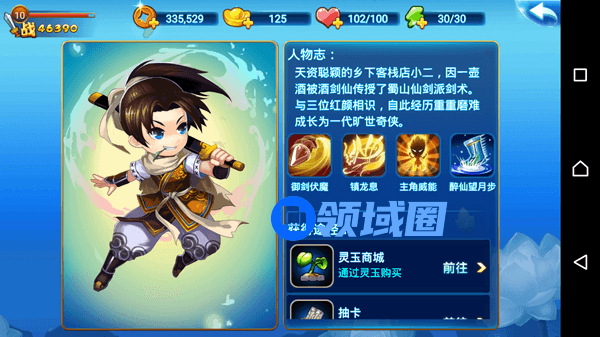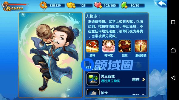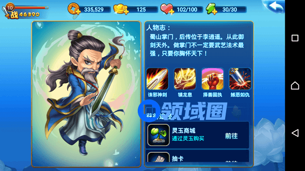 人物志:蜀山掌门,后传位于李逍遥。从此御剑天外。做掌门不一定要武艺法术最强,只要你胸怀天下!可以通过“灵玉商城”、抽卡获得剑圣这个卡牌的哦。