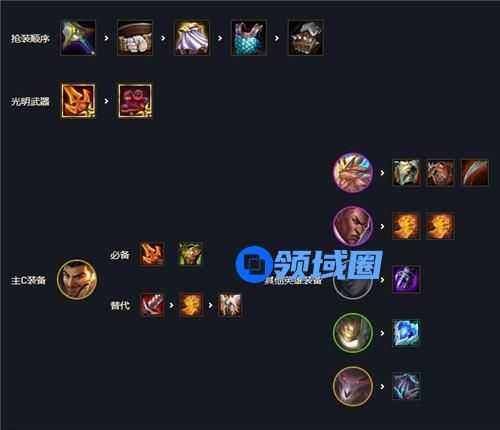 早期过渡:开局抢大剑,六光阿克尚核心两件套,杀人剑和狂徒,第三件补续航装,饮血、光明正义,光明春哥都行。前期三光三盾开局最舒服,装备给拉夫或刀妹都行。