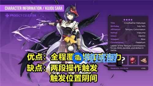 目前从九条裟罗的技能来看,是释放技能以后,用弓箭蓄力攻击以后会在命中位置留下乌羽,简单来说就是羽毛,然后一段时间后就会爆炸,这个时间段会给当前场上角色提供一个攻击力加成,据说是6秒。