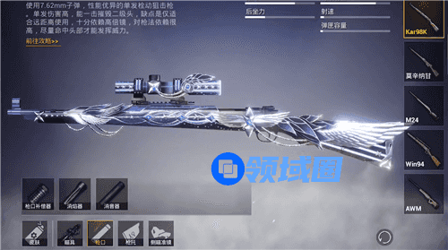 最亮眼的就是这个暗翼战神特效枪了,kar98k,外观很炫酷,羽翼特效,八倍镜的特效更是爆炸,个人推测没有2000RMB是拿不下来的,而且光是外观真的已经是目前的颜值巅峰了,价格肯定是不会低的,目前的瞄具最多只有8倍镜,没有更多了。
