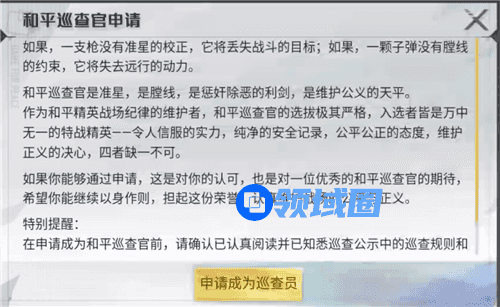 和平精英巡查员是一个非常光荣的一个称号,玩家通过视频审核,然后提交作弊类型,这样可以净化游戏环境,不过前提条件是要成为一个视频巡查员,很多玩家都还不知道巡查员怎么申请,今天小编就给大家介绍一下具体的条件,赶紧来看看吧。