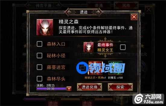 点击搜索会随机进入4个小关卡中的一个,每次消耗2点体力。当4个小关卡全部完成即可有几率进入boss关卡。全部通关后获得最终奖励。