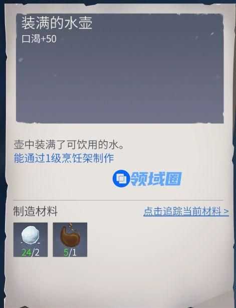 捡到相应的材料后,点击【制造】-【物品】,选择【装满的水壶】,就可以制作了。