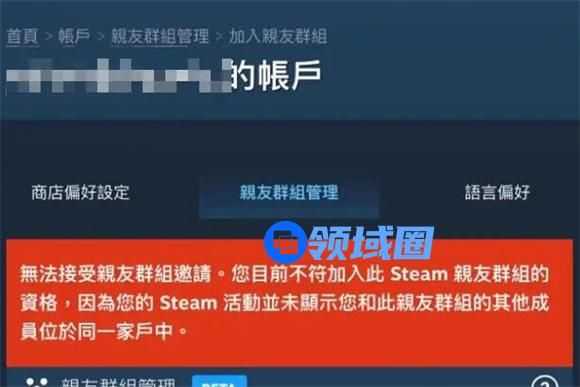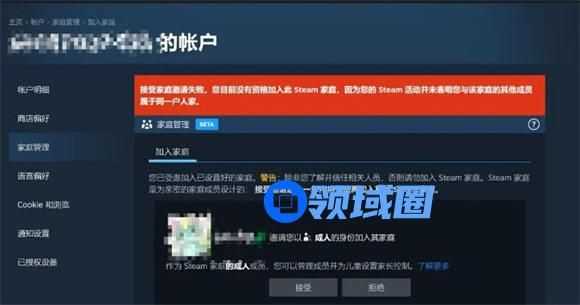如果主副账号不是同一区,会如下显示:接受家庭邀请失败。您目前没有资格加入此 steam 家庭,因为您的 steam 活动并未表明您与该家庭的其他成员属于同一户人家。