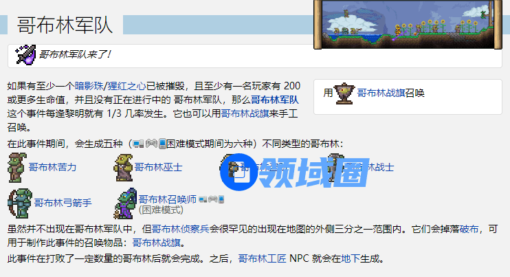 2,哥布林军队,至少一个暗影珠/猩红之心已被摧毁,且至少有一名玩家有 200 或更多生命值,并且没有正在进行中的 哥布林军队,那么哥布林军队这个事件每逢黎明就有 1/3 几率发生。