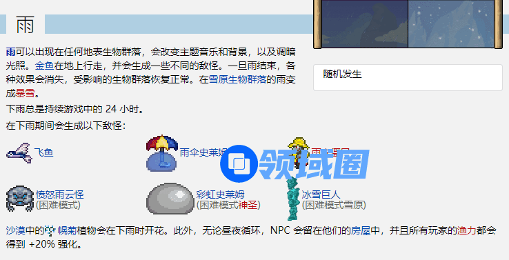 3,雨雨,可以出现在任何地表生物群落,会改变主题音乐和背景,以及调暗光照。金鱼在地上行走,并会生成一些不同的敌怪。