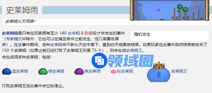 4,史莱姆雨,史莱姆雨是只有在玩家拥有至少 140 生命和 8 防御后才会发生的事件,各种史莱姆会不断从天空中落下,直到白天或黑夜结束。如果玩家在此事件自然结束前击杀了 150 个史莱姆,则会生成史莱姆王