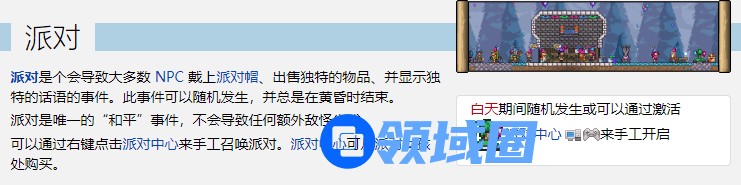 5,派对,派对是个会导致大多数 NPC 戴上派对帽、出售独特的物品、并显示独特的话语的事件。此事件可以随机发生,并总是在黄昏时结束。派对是唯一的“和平”事件,不会导致任何额外敌怪生成。