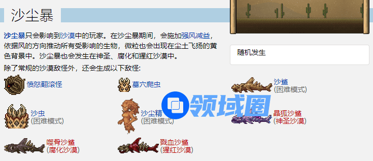 6,沙尘暴,沙尘暴只会影响到沙漠中的玩家。在沙尘暴期间,会施加强风减益,依据风的方向推动所有受影响的生物,微粒也会出现在尘土飞扬的黄色背景中。