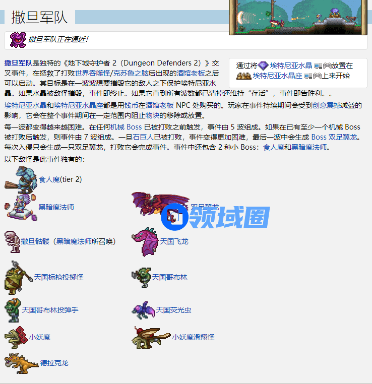 7,撒旦军队,在拯救了打败世界吞噬怪/克苏鲁之脑后出现的酒馆老板之后可以启动。其目标是在一波波想要摧毁它的敌人之下保护埃特尼亚水晶。