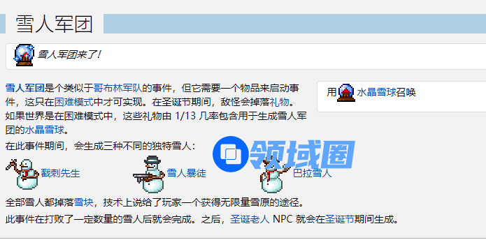8,雪人军团,雪人军团是个类似于哥布林军队的事件,但它需要一个物品来启动事件,这只在困难模式中才可实现