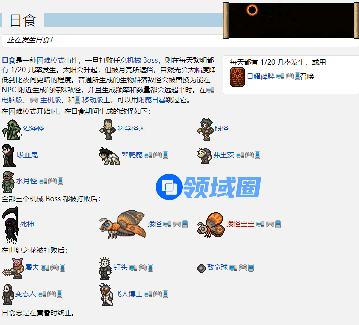 9,日食,日食是一种困难模式事件,一旦打败任意机械 Boss,则在每天黎明都有 1/20 几率发生。