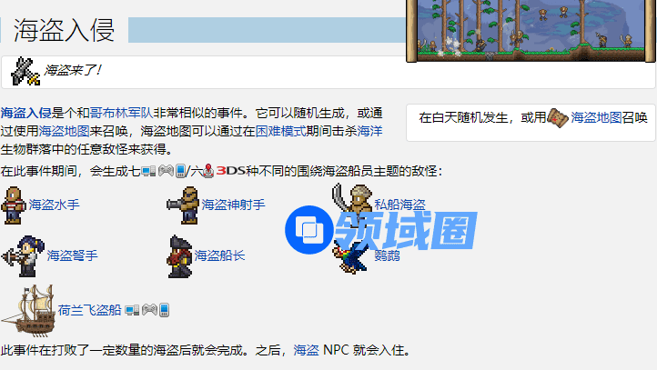 10,海盗入侵,海盗入侵是个和哥布林军队非常相似的事件。它可以随机生成,或通过使用海盗地图来召唤,海盗地图可以通过在困难模式期间击杀海洋生物群落中的任意敌怪来获得