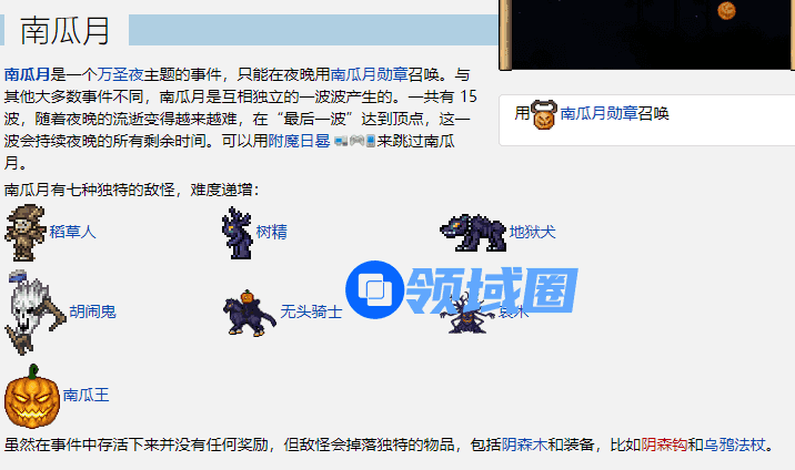 11,南瓜月,南瓜月是一个万圣夜主题的事件,只能在夜晚用南瓜月勋章召唤。与其他大多数事件不同,南瓜月是互相独立的一波波产生的。