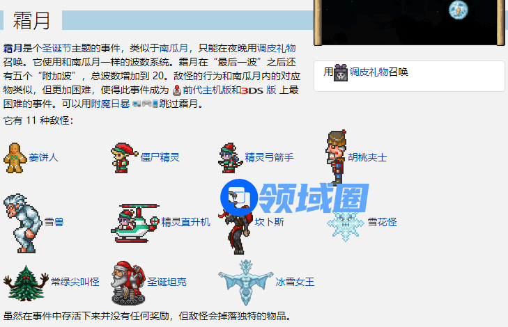 12,霜月,霜月是个圣诞节主题的事件,类似于南瓜月,只能在夜晚用调皮礼物召唤。