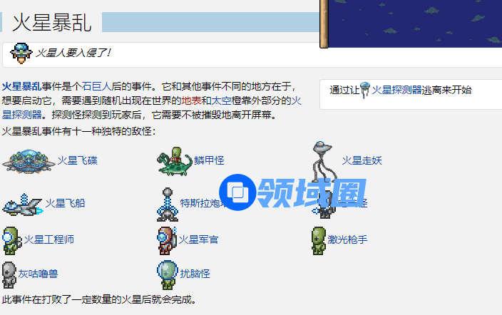 13,火星暴乱,火星暴乱事件是个石巨人后的事件。它和其他事件不同的地方在于,想要启动它,需要遇到随机出现在世界的地表和太空橙靠外部分的火星探测器。