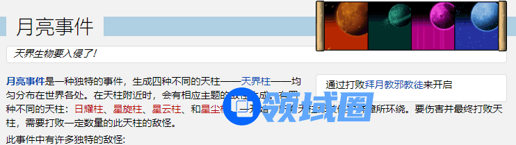 14,月亮事件,月亮事件是一种独特的事件,生成四种不同的天柱——天界柱——均匀分布在世界各处。