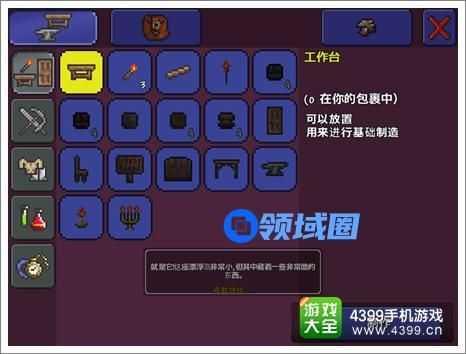 当房屋的外型已被建造出来后,下一个步骤就是建立一个能够让你制造其他东西的工作台。你需要最少10个木材才能制造一个工作台。要制作工作台,点击道具栏并在屏幕的左边会有可製作的物品选项,滚动它并选择。在工作台的图示右边会显示出所需的材料。只需要左键点击图标并将其拉到道具栏内。选择道具栏的工作台(需放置在第一列)并点选要放置的位置以放置工作台,请确认房子内有足够的空间放置。要使用工作台需要站在工作台附近并有足够的材料即可制作。