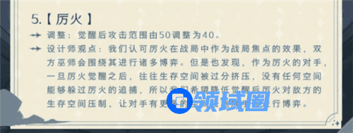 从设计师的观点就可以看出来厉火最严重的问题就是攻击范围,攻击范围太大,因此对它的攻击范围动刀了,改动以后按理说应该会有所减少压制力,毕竟范围直接减小了10点。