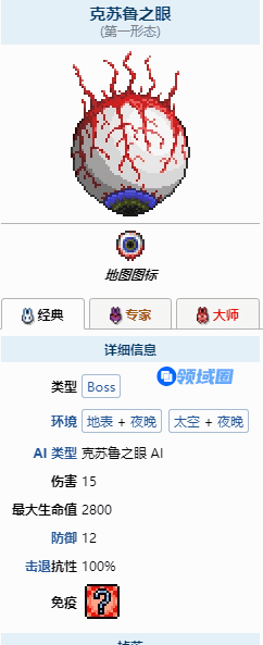 首先,作为第二个BOSS的克苏鲁之眼,很多小伙伴们以为很容易,那么我想说小伙伴们想的太简单了,现在我们需要先把克苏鲁之眼召唤出来,召唤出来是有条件的,玩家需要用可疑眼球来手动召唤,然后就是该世界至少有一个玩家拥有 200 点以上的生命上限和 10 点以上的防御。至少获得四个NPC。克苏鲁之眼没有在黎明(上午4:30)前被打败,或者所有玩家在战斗中死亡或逃跑,它将会消失。