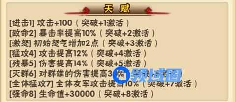 不愧为是一名出色的法师,他的技能、缘分、天赋等,无不十分注重攻击,尤其是上图的攻击天赋,当然,一切的攻击都是为了生存。所以当贾诩进阶到顶时,生命值加30000,提高贾诩在对战时的生存能力。