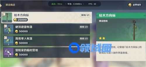 商品:枯木方向标、硬顶避雷帐篷、简易单人帐篷、冒险家的临时营地