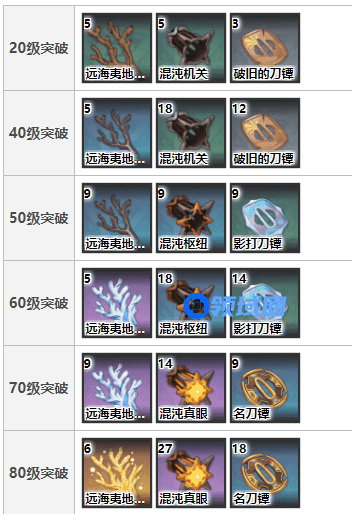 20级突破:远海夷地的瑚枝*3、混沌机关*5,破旧的刀镡*,3